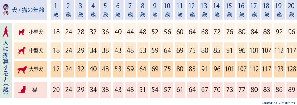 (以下にワンちゃん・ネコちゃんの年齢を、人に当てはめた表を載せさせていただきます。あくまで目安となりますが、ご参考ください)